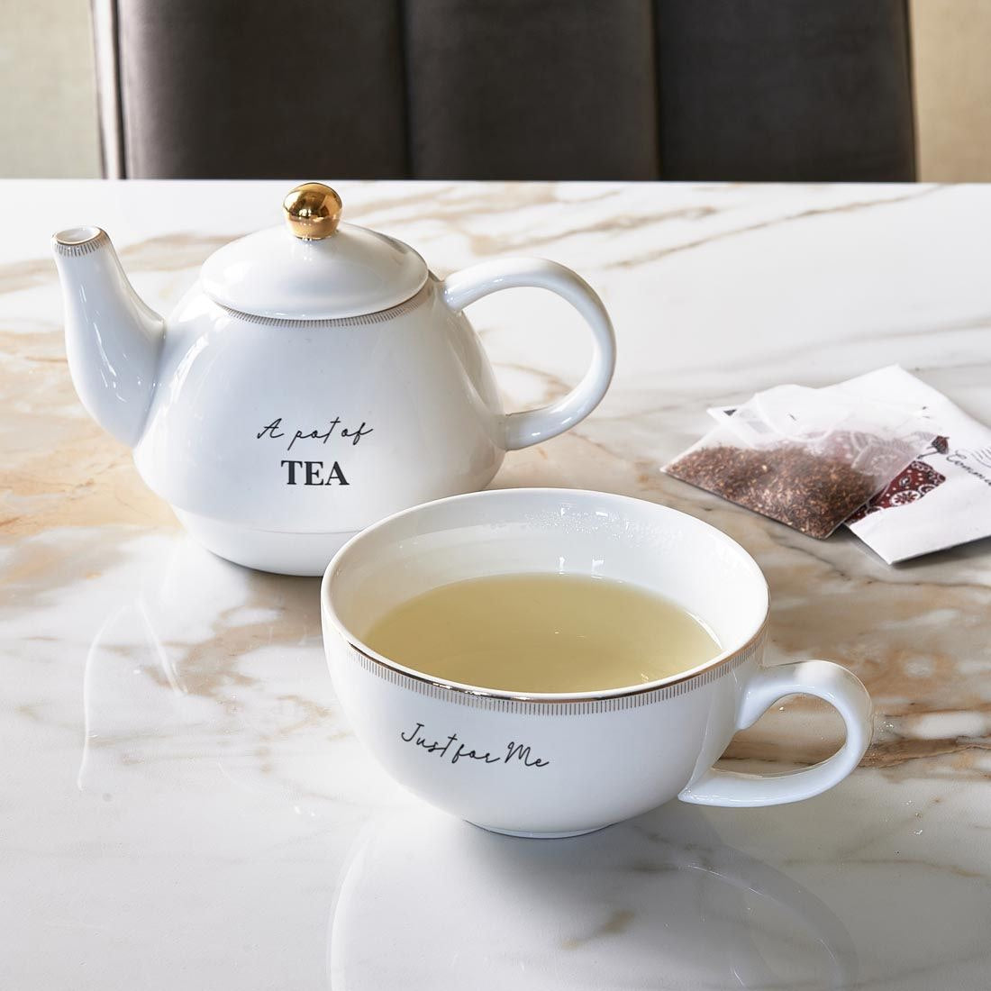 De RM Elegant Tea For One is een witte theepot met daaronder een kopje. Het theepotje is groot genoeg voor een of twee kopjes thee. De theepot en het kopje zijn gemaakt van wit porselein met gouden details zoals het gestreepte patroon en de gouden knop op het dekseltje. Op de RM Elegant Tea For One staat: ‘A pot of Tea, Just for Me’.